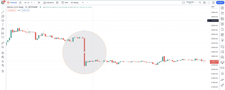 Ось останній графік BTC-USD, що показує значне падіння. Цінова динаміка біткоїна швидко змінилася, знизившись з рівнів 23 400 доларів до менше 22 000 доларів за короткий проміжок часу.