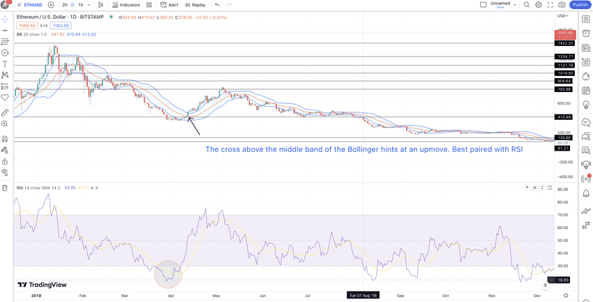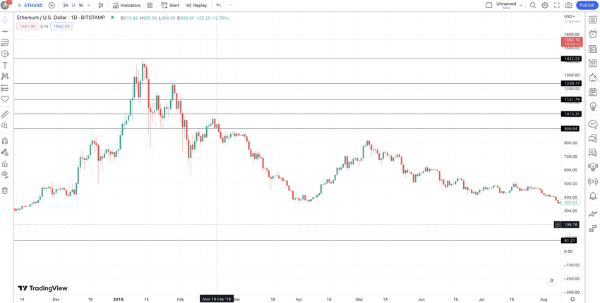 Ось графік ETH-USD від BitStamp з акцентом на ціни 2018 року. Ціна ETH у січні 2018 року досягла 1422 доларів, лише щоб впасти до 81 долара до грудня 2018 року. Зверніть увагу, наскільки близько були початкові рівні підтримки та опору, з одним випадком падіння, що призвело до іншого.