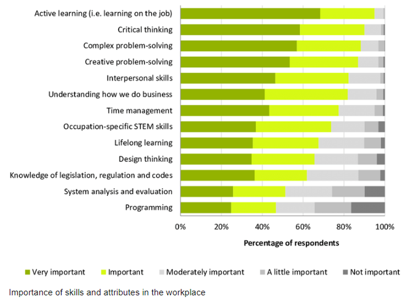 Роботодавців попросили оцінити важливість різних навичок і якостей працівників, а також указати додаткові уміння, які вони вважають важливими для їхньої роботи. Вище наведено результати дослідження. Комунікація згадувалася найчастіше.