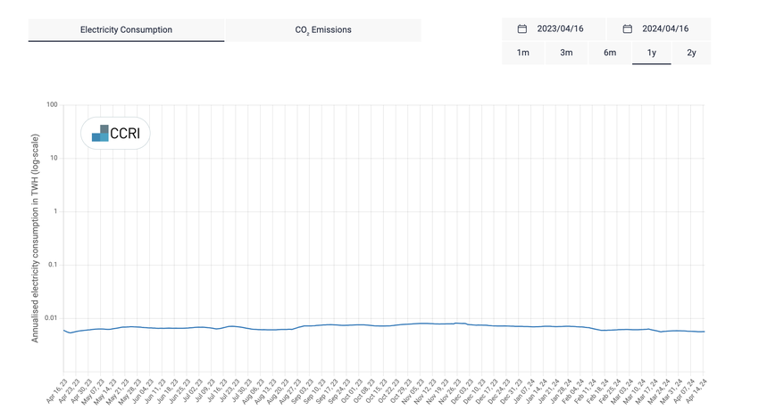 Рішення перейти на PoS також було підживлене прихильністю Ethereum до сталого розвитку та зменшення вуглецевого сліду. Ця мета була успішно досягнута, принаймні, якщо ми подивимося на річне споживання енергії Ethereum. За даними Crypto Carbon Ratings Institute (CCRI), з квітня 2023 року по квітень 2024 року Ethereum підтримував стабільний рівень споживання електроенергії.