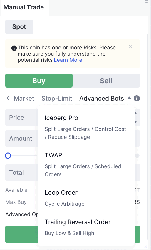 4. Оберіть тип ордера — Limit, Market, Stop-Limit тощо, щоб здійснити торгівлю за найкращою можливою ціною. На Gate.io ви також можете використовувати торгових ботів для управління своїм ETF.