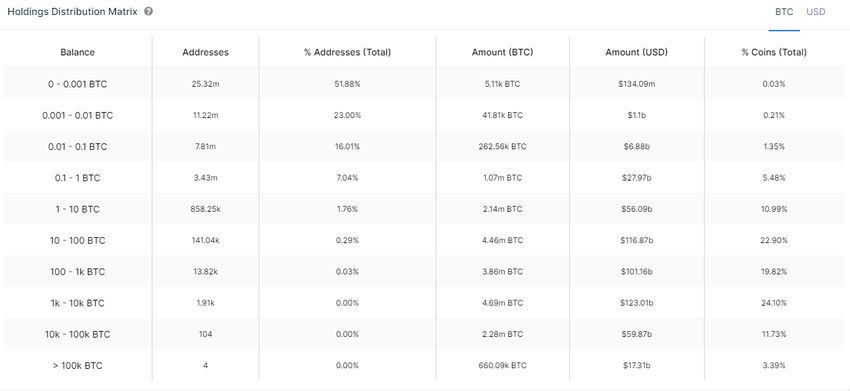 На завершення, завжди корисно аналізувати склад власників. По суті, необхідно оцінити, чи володіють великі власники значною частиною пропозиції та що ці особи чи організації роблять із цими активами. Хоча накопичення великими власниками може бути позитивним сигналом, якщо лише кілька великих власників контролюють більшу частину активів, роздрібні інвестори опиняються залежними від їхніх дій. На зображенні нижче показано матрицю складу власників для біткоїна, яка відображає, скільки адрес володіють якою часткою пропозиції.