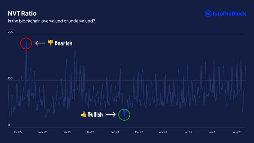 Використання цього індикатора доволі просте. Співвідношення NVT допомагає оцінити, чи є блокчейн переоціненим чи недооціненим. Низьке значення NVT означає, що в мережі обробляється значна цінність порівняно з вартістю самої мережі, що є позитивним сигналом. І навпаки, дуже високе значення NVT може бути негативним, оскільки свідчить про низьку цінність транзакцій порівняно з вартістю мережі.