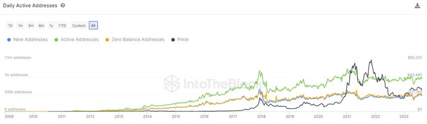 Ще одним цінним показником є співвідношення активних адрес. Цей індикатор показує, який відсоток від загальної кількості адрес є активним. Зростання співвідношення активних адрес свідчить про те, що більша частина адрес активно використовує мережу, що є позитивним знаком. І навпаки, зниження може викликати занепокоєння.