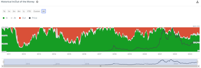 У довгостроковій перспективі ви можете ознайомитися з історичною інформацією In/Out of The Money. Тут ви бачите, який відсоток адрес був у збитку або прибутку в минулому. Якщо ви бачите, що поточний рівень утримувачів у прибутку дуже високий порівняно з минулими рівнями, це може бути не найкращий момент для придбання цього активу.