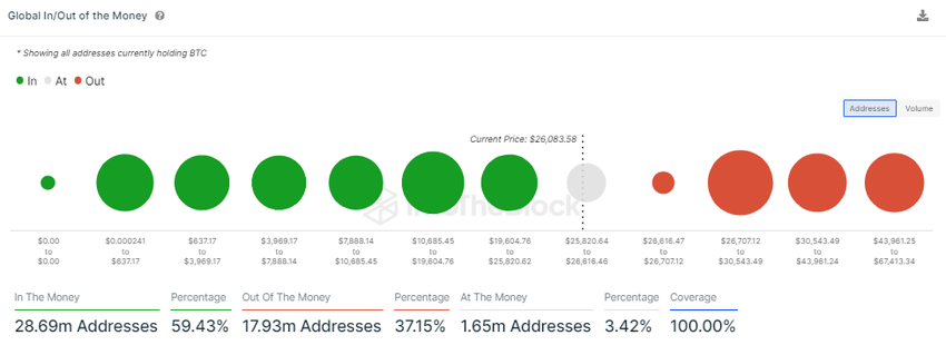 Індикатор “In & Out of the Money” є цінним інструментом для розуміння профілю прибутків і збитків власників. На зображенні нижче ви можете побачити приклад цього індикатора. Бульбашки представляють адреси, які купили актив у певному ціновому діапазоні. Чим більші бульбашки, тим більше обсягу було куплено в цьому ціновому діапазоні.