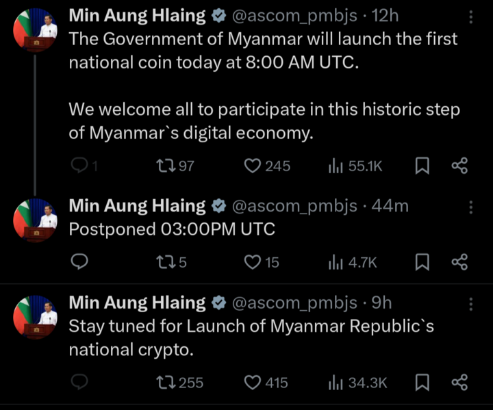 22 лютого на X-акаунті Мін Аун Хлаїна з’явилися публікації про так званий запуск національної криптовалюти.