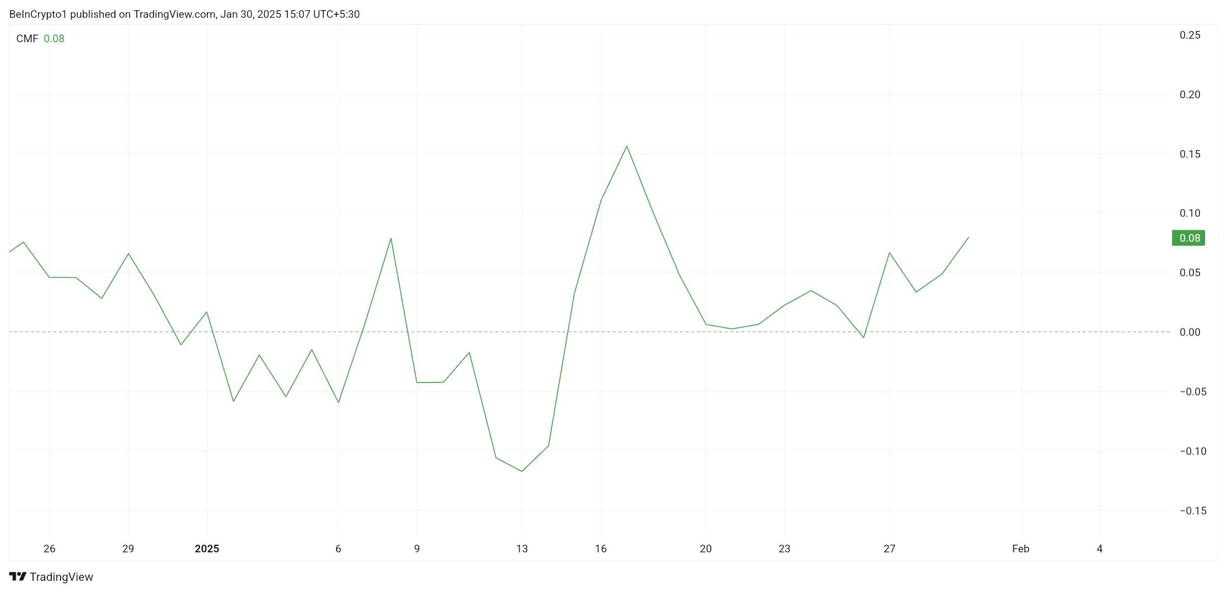 Макромоментум Litecoin залишається у сприятливій позиції, підтриманий покращенням технічних індикаторів. Chaikin Money Flow (CMF), ключовий індикатор притоку та відтоку капіталу, піднявся вище нульової лінії. Це вказує на зростаючий тиск покупок, що підкріплює потенціал для стійкого зростання.