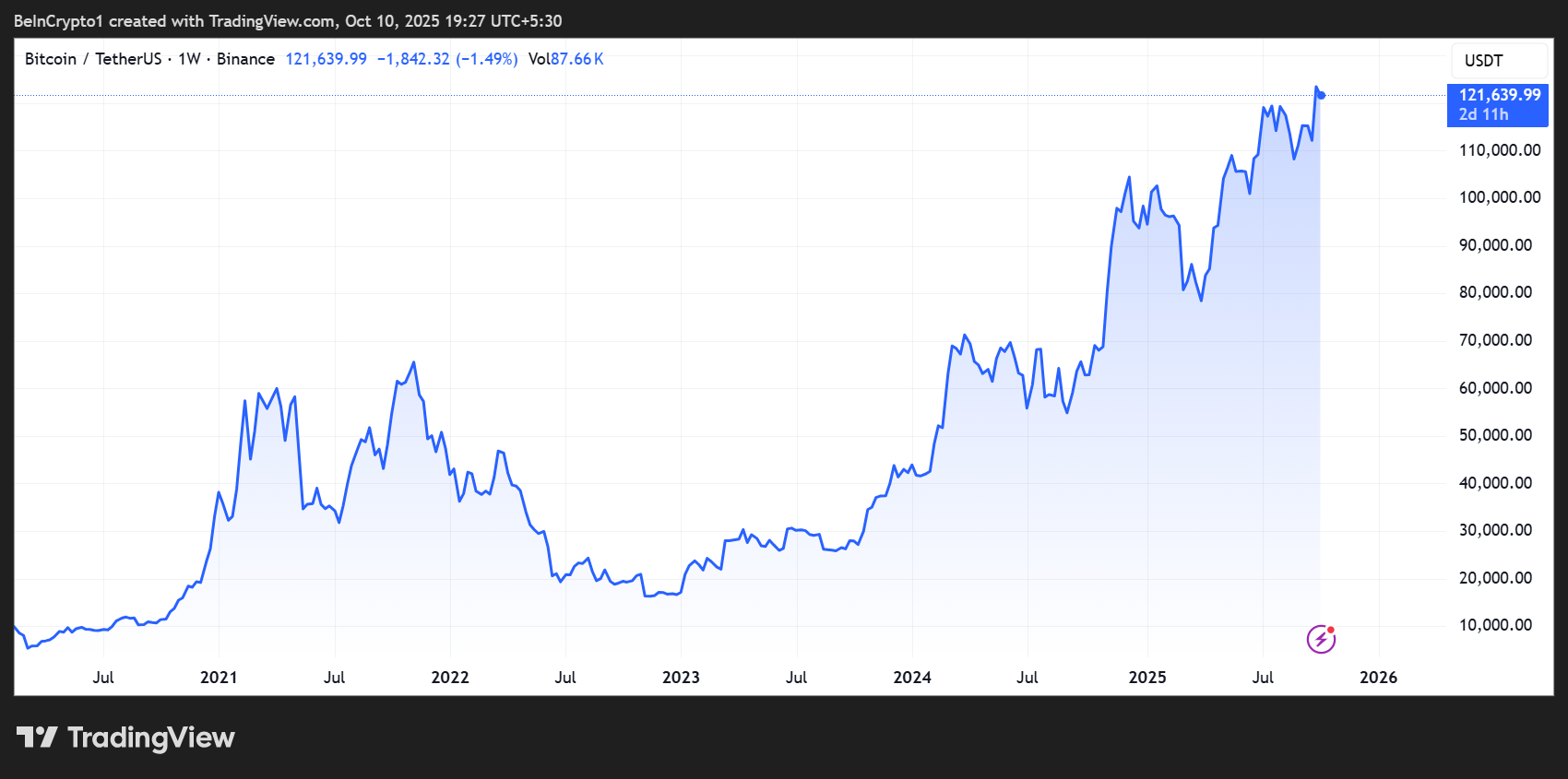 Оскільки уряд США залишається закритим на тлі чергового бюджетного глухого кута, біткойн зріс до нового історичного максимуму, як повідомляється в нещодавній публікації US Crypto News . Після того, як криптовалюта досягла максимуму в $126 199, вона відмовилася і на момент написання цієї статті торгувалася за $121 960.