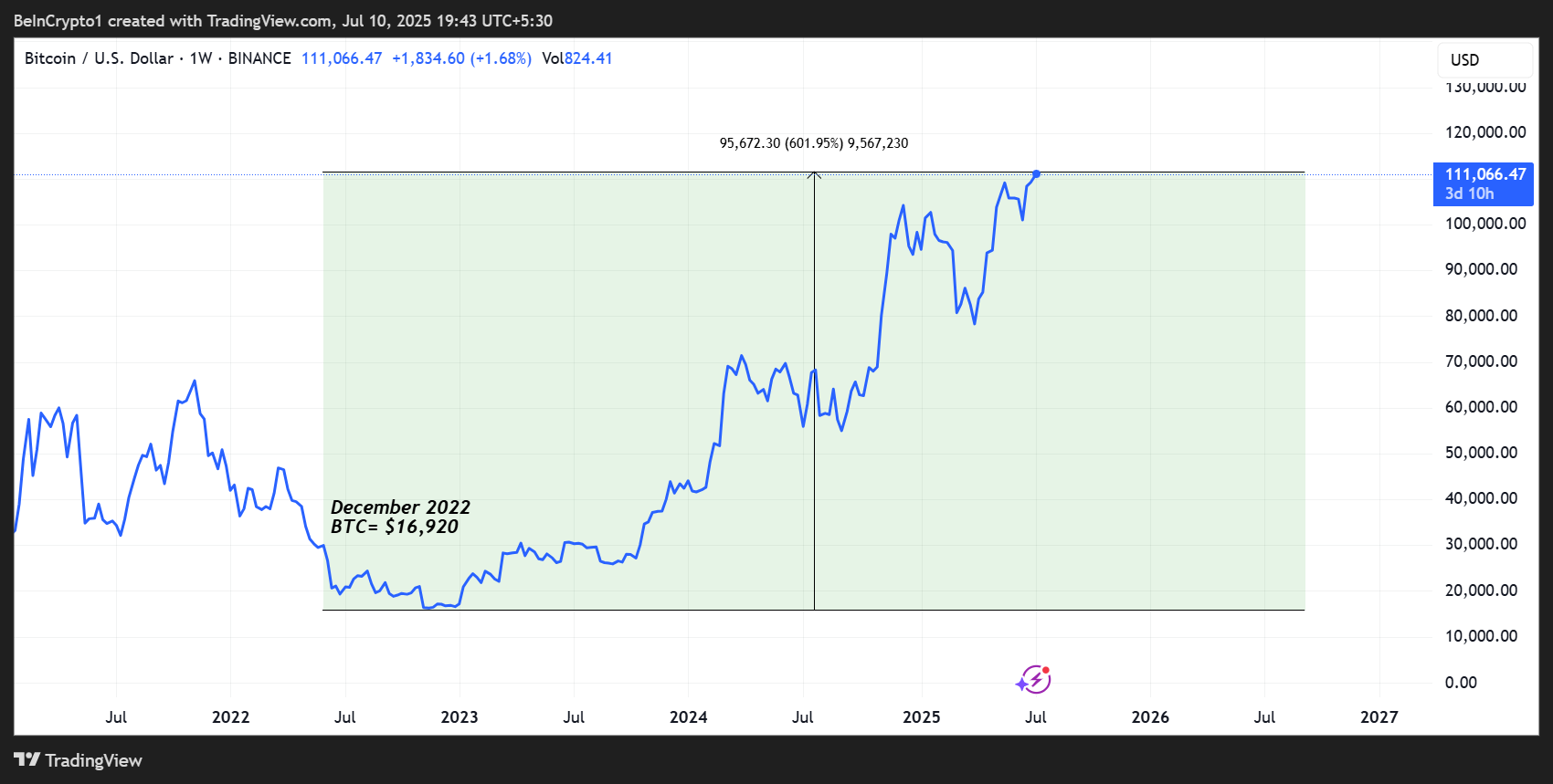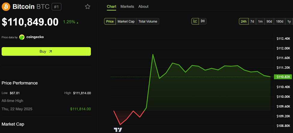 Хоча оптимізм все ще переважає, ціна біткоїна досягла нового історичного максимуму (ATH), досягнувши 111 999 доларів на Binance. На момент написання статті BTC торгувався за 110 849 доларів, що на 1,25 % більше за останні 24 години.