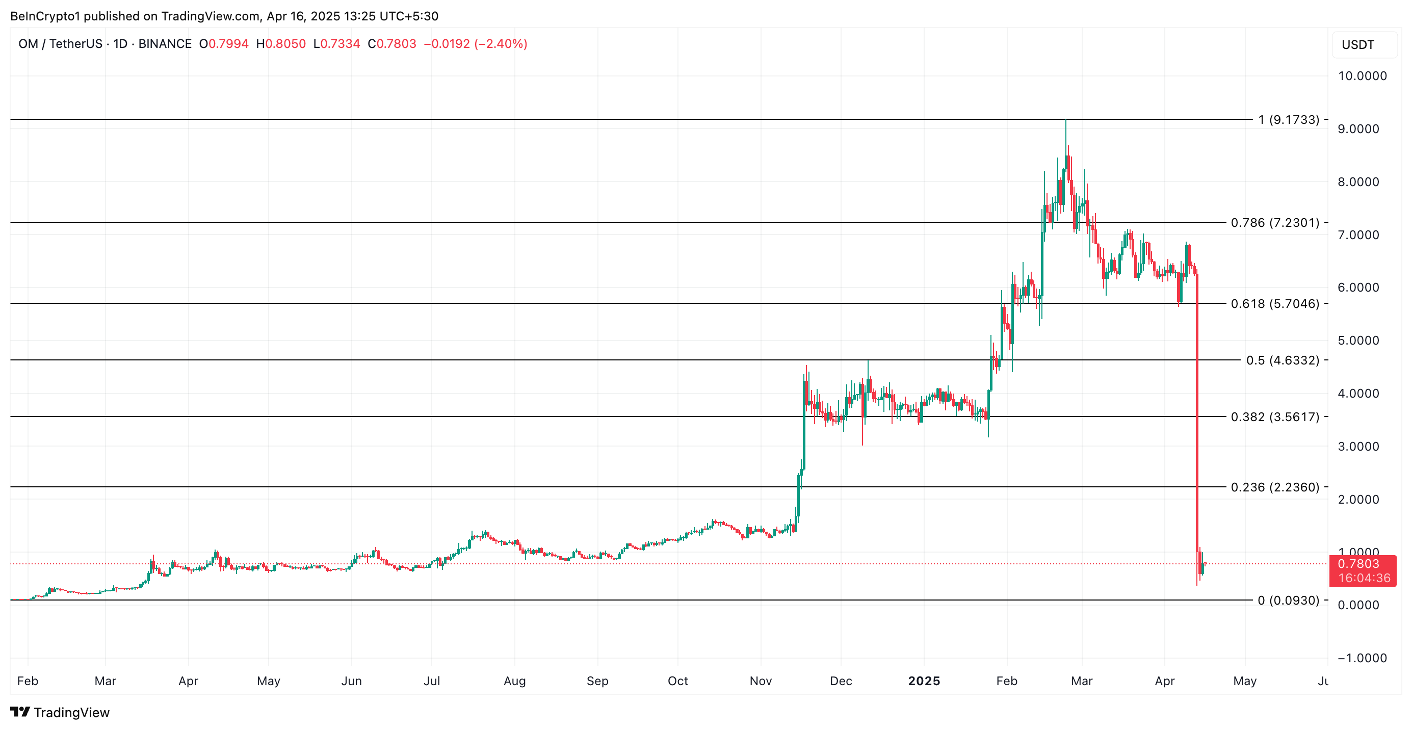 Після історичного обвалу ціни, OM від Mantra демонструє вражаюче відновлення. Альткоїн впав більш ніж на 90% 13.04.2025, знизившись з 6,30 доларів до менш ніж 0,50 доларів за кілька годин.