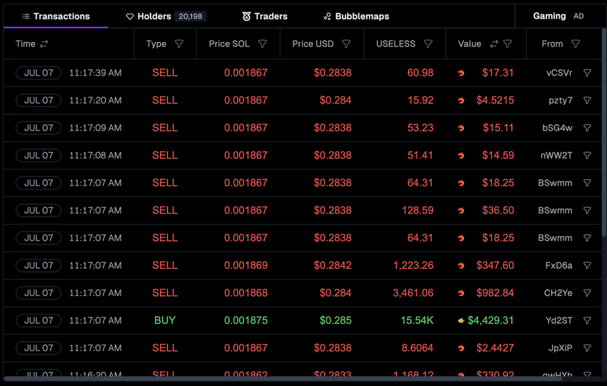 На момент написання, потік живих транзакцій є справжньою різаниною. Продаж за продажем потрапляє в книги, з рідкісними зеленими свічками між ними. Роздрібний продаж 3 461 USELESS (982,84 доларів) і ще один з 1 223 токенів (347,60 доларів) відбулися зовсім недавно.