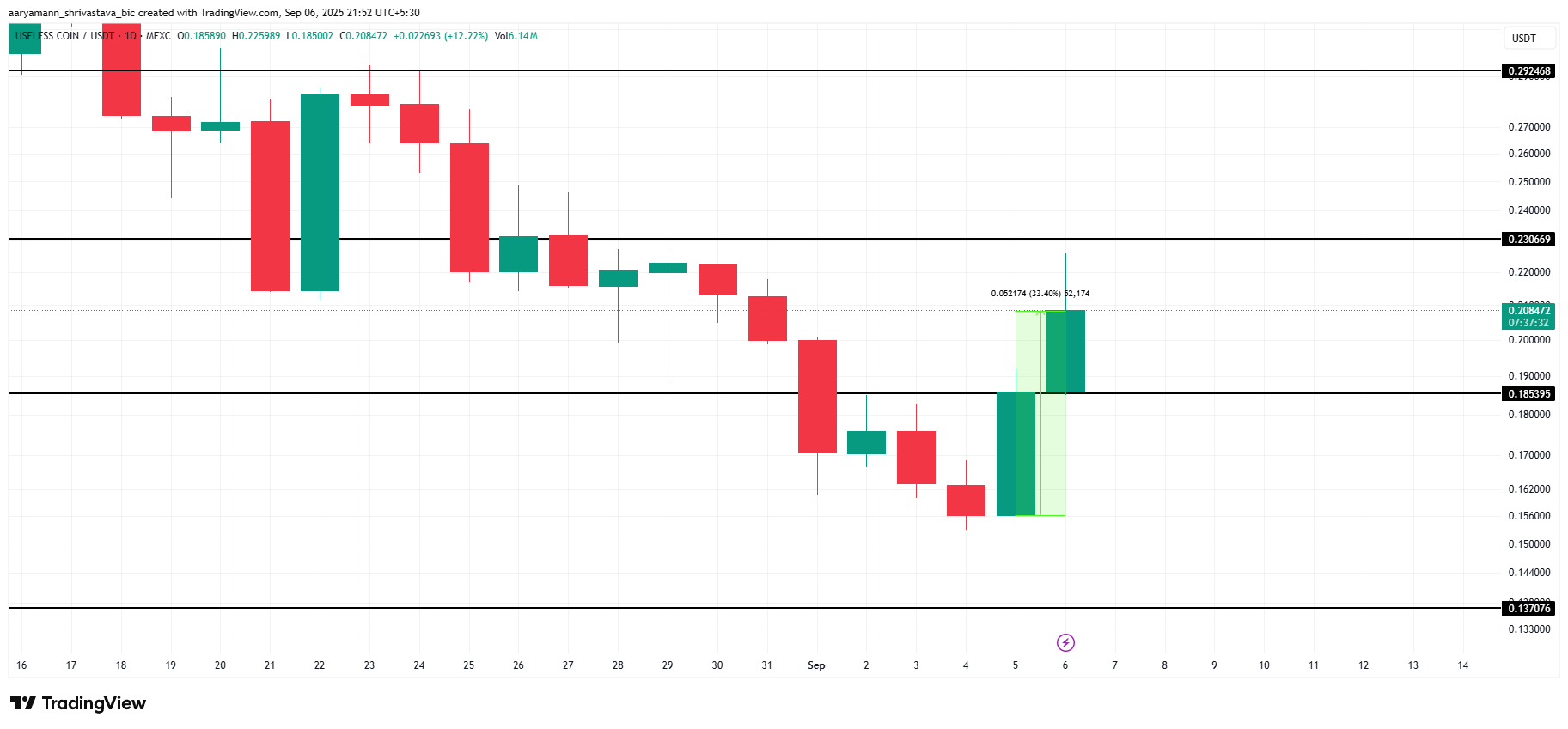 На момент написання статті USELESS торгується на рівні 0,208 долара, перейшовши на підтримку на 0,185 долара після зростання на 31%. Наступний опір знаходиться на рівні 0,230 долара – ключового бар’єру, який мем-монета має подолати.