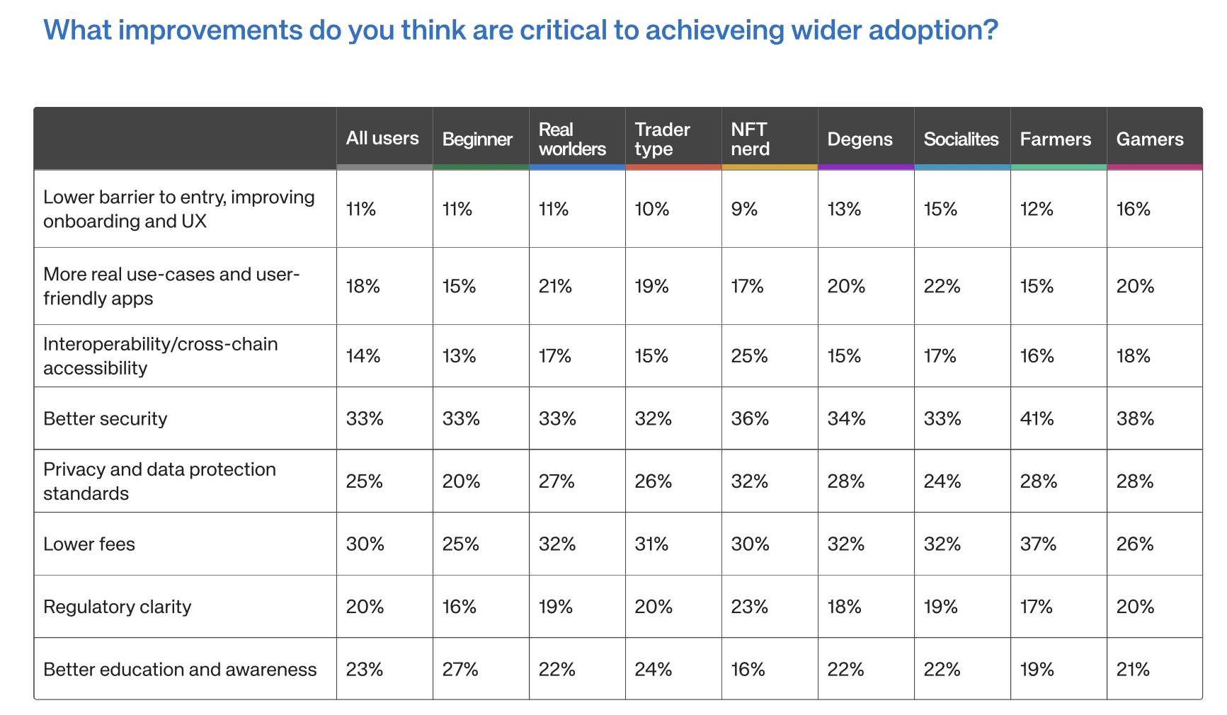 Однак, перш ніж може відбутися масове впровадження, користувачі вважають, що кілька областей потребують покращення. Краща безпека є пріоритетом, причому 33% користувачів вважають її критично важливою для ширшого впровадження. Крім того, 25% користувачів виділили стандарти конфіденційності та захисту даних.