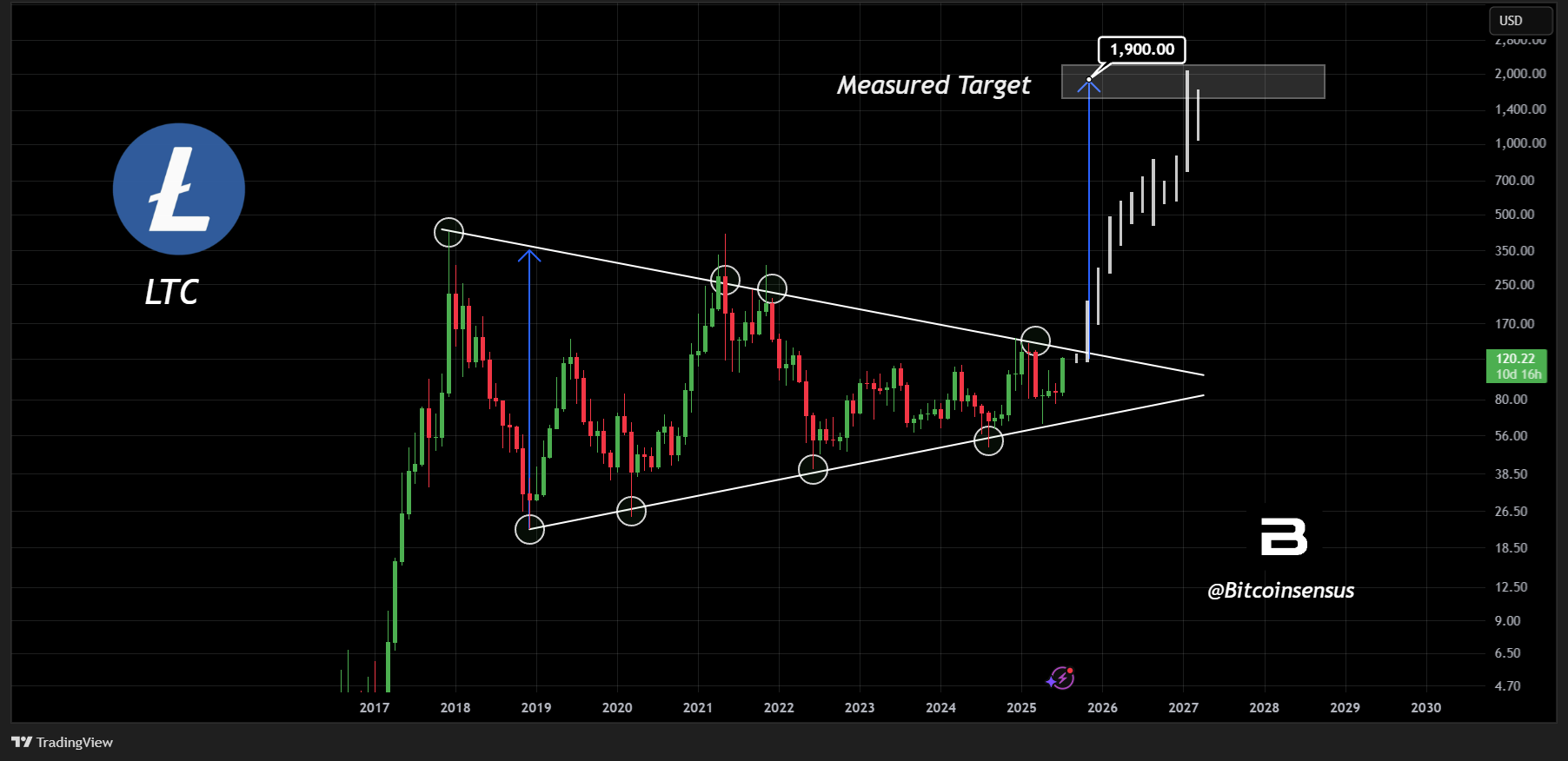 Аналітики також демонструють високий оптимізм щодо потенціалу LTC. У нещодавньому дописі на X (раніше Twitter) Bitcoinsensus зазначив, що токен наближається до прориву з 7-річного каналу стиснення. Якщо Litecoin прорветься, це може сигналізувати про сильне зростання ціни.