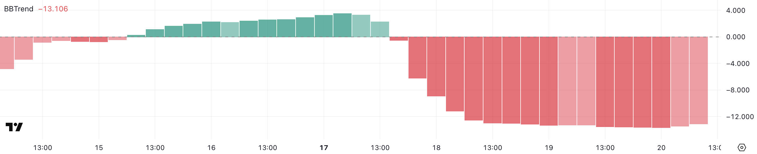 Це надзвичайно негативне значення свідчить про те, що тиск на продаж досяг свого піку, збільшуючи ймовірність подальшого зниження ціни. Однак, якщо BBTrend почне відновлюватися, це може вказувати на потенційний розворот або стабілізацію ціни, але слід бути обережним, оскільки ведмежий моментум залишається сильним.