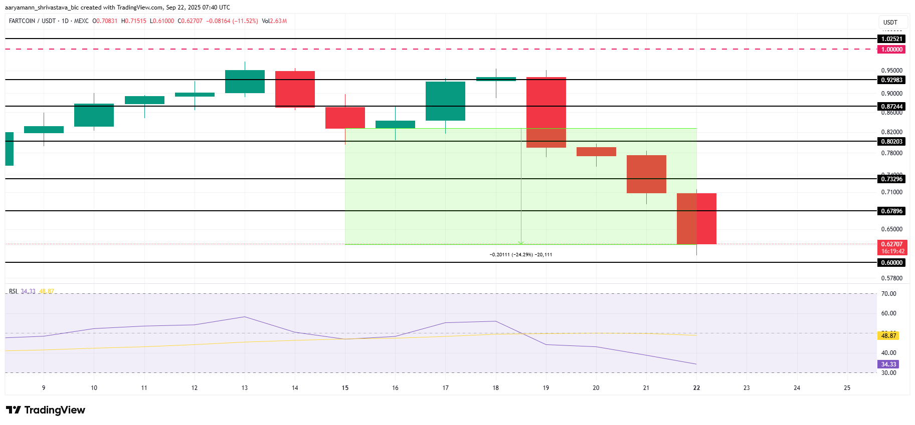 Індекс відносної сили (RSI) наближається до порогу перепроданості, що історично сигналізує про можливість відскоку активів. Якщо імпульс зміниться, FARTCOIN може відскочити від рівня підтримки в 0,600 долара, націлившись на 0,678 долара і, можливо, на 0,732 долара.