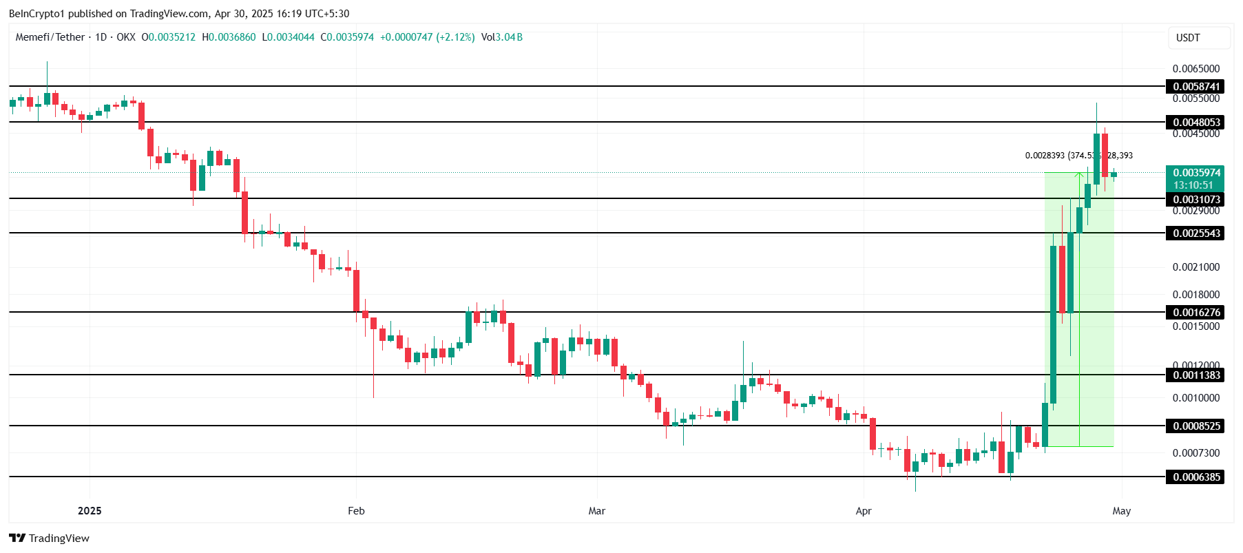 MEMEFI став одним із найуспішніших токенів цього місяця, зростаючи на 374 % лише за десять днів. Мемкоїн наразі торгується на рівні 0,0035 доларів, підкріплений хвилею позитивних настроїв на ринку.
