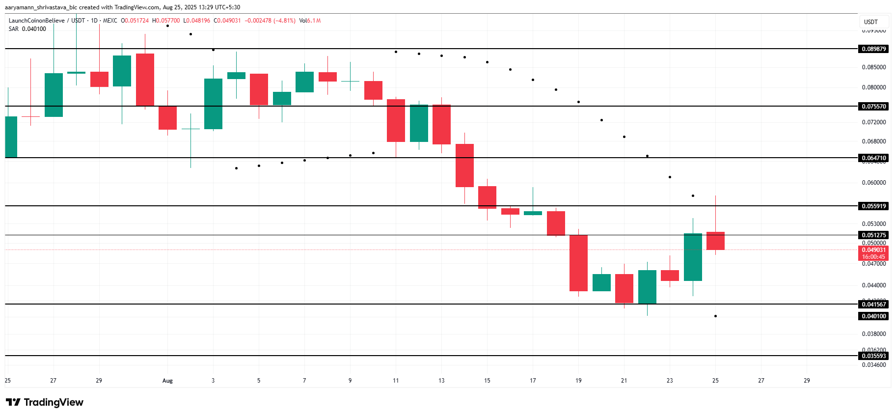 Індикатор Parabolic SAR під свічками говорить про те, що LAUNCHCOIN може увійти в висхідний тренд. Наразі він оцінюється в 0,049 долара і має потенціал для зростання рівня. Якщо токен зможе забезпечити рівень підтримки в 0,055 долара, це може створити основу для подальшого руху вгору, привертаючи більше бичачих настроїв.