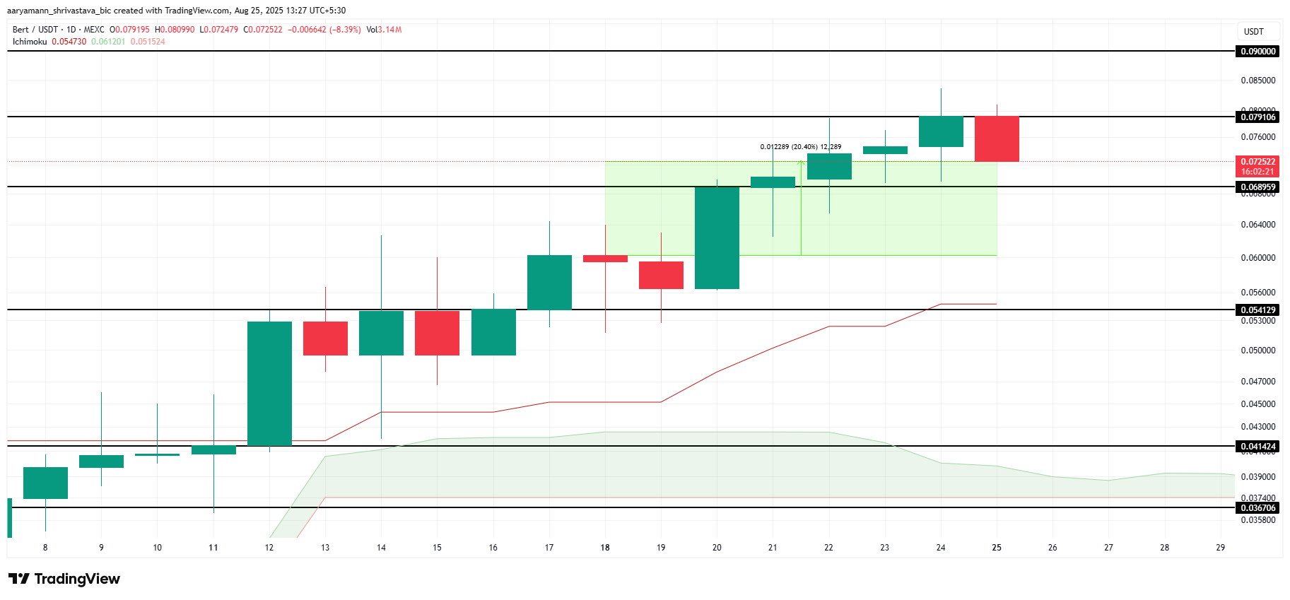 Хмара Ішимоку, розташована під свічками, сигналізує про те, що бичачий імпульс, швидше за все, збережеться. Якщо ця тенденція збережеться, BERT може подолати позначку в 0,079 долара і встановити її як підтримку. Успішний прорив може прокласти шлях до подальшого зростання з потенційною цільовою ціною в 0,090 долара, що викликає оптимізм у інвесторів.