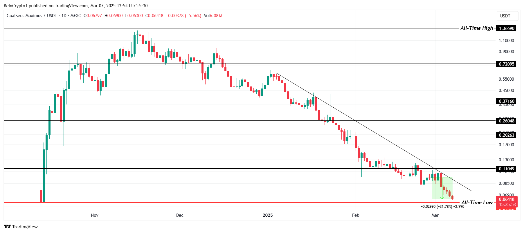 Наразі GOAT торгується лише трохи вище свого історичного мінімуму (ATL) у 0,0601 доларів, зазнавши значного падіння на 37% за останній тиждень. Якщо ринкові умови залишаться несприятливими, цей альткоїн може впасти нижче 0,0600 доларів, що потенційно встановить новий історичний мінімум і поглибить його втрати.