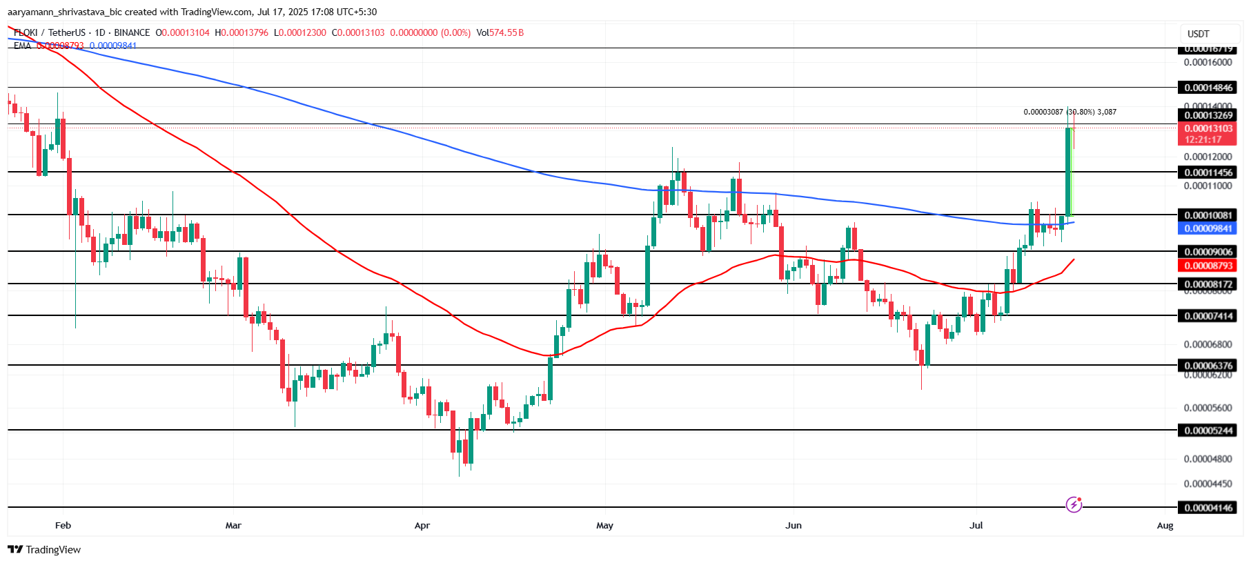 Ціна FLOKI зросла на 30 % за останні 24 години, досягнувши 0,000131 доларів, що є 5-місячним максимумом. Це вражаюче зростання позиціонує мемкоїн для подальшого бичачого імпульсу. Продовження ралі може призвести до нових можливостей зростання для інвесторів.