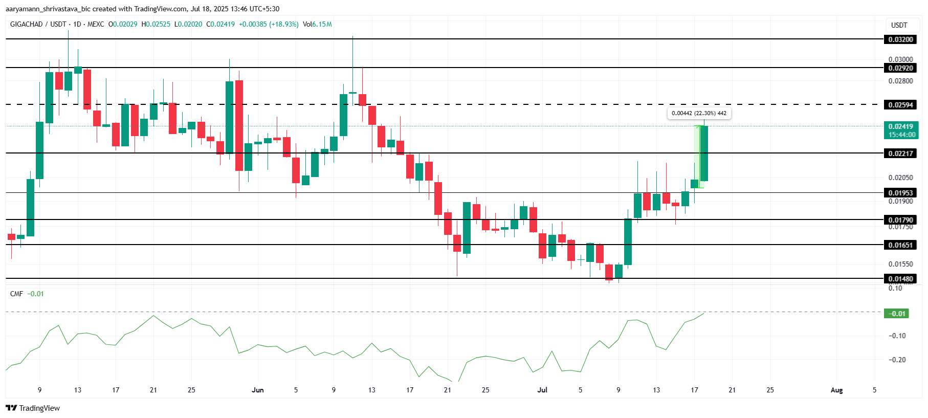 Ціна GIGA зросла на 22,3 % за останні 24 години, досягнувши 0,024 долара, що робить його одним із найуспішніших мемкоїнів сьогодні. Альткоїн зараз націлений на рівень опору 0,025 долара, з наростаючим імпульсом для потенційного прориву. Сильне зростання сигналізує про подальший бичачий потенціал у короткостроковій перспективі.