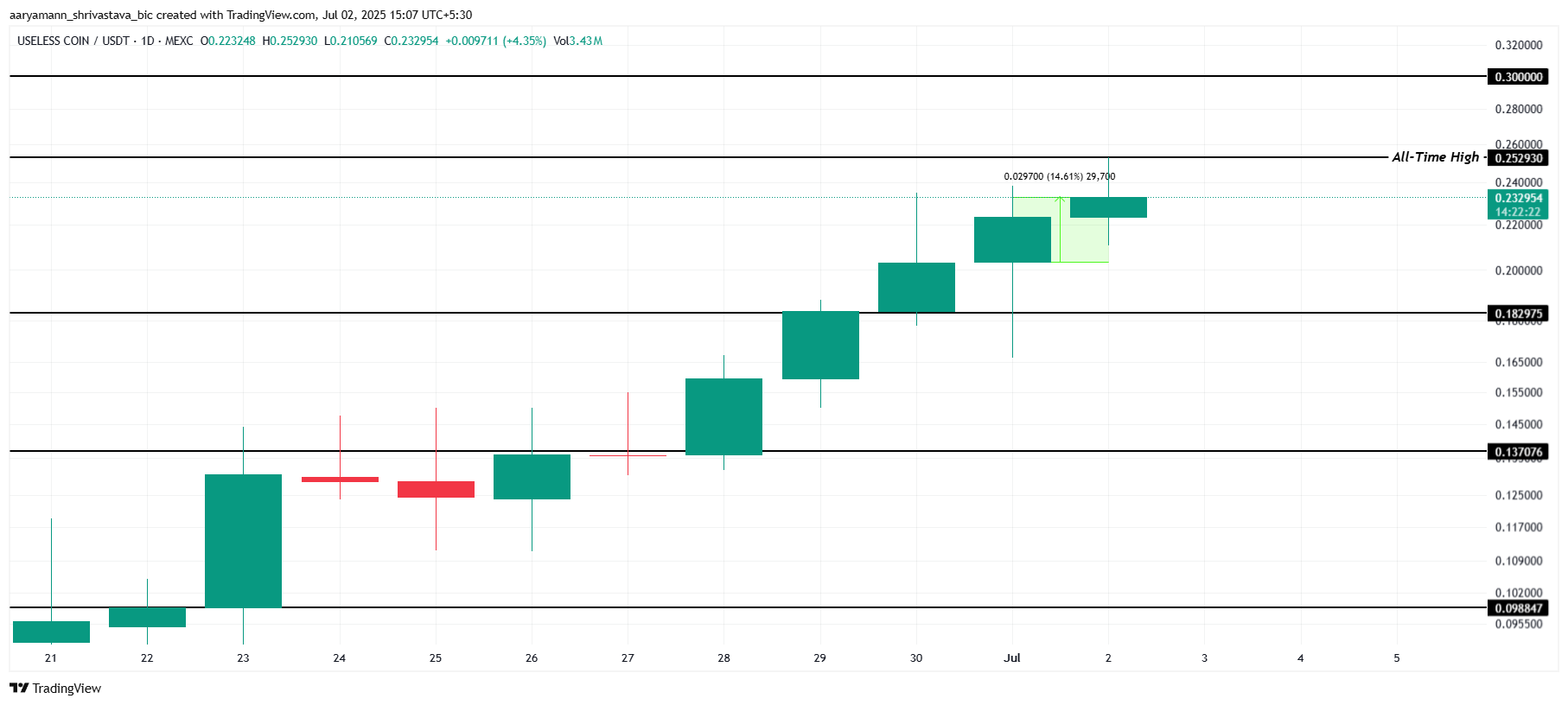 USELESS продовжує демонструвати сильні результати, досягнувши нового історичного максимуму (ATH) у 0,252 долара сьогодні. Мемкоїн зріс на 14,6 % за останні 24 години, наразі торгуючись на рівні 0,232 долара. Це вражаюче зростання свідчить про потенціал токена залучати більше інвесторів, зберігаючи позитивний прогноз у короткостроковій перспективі.