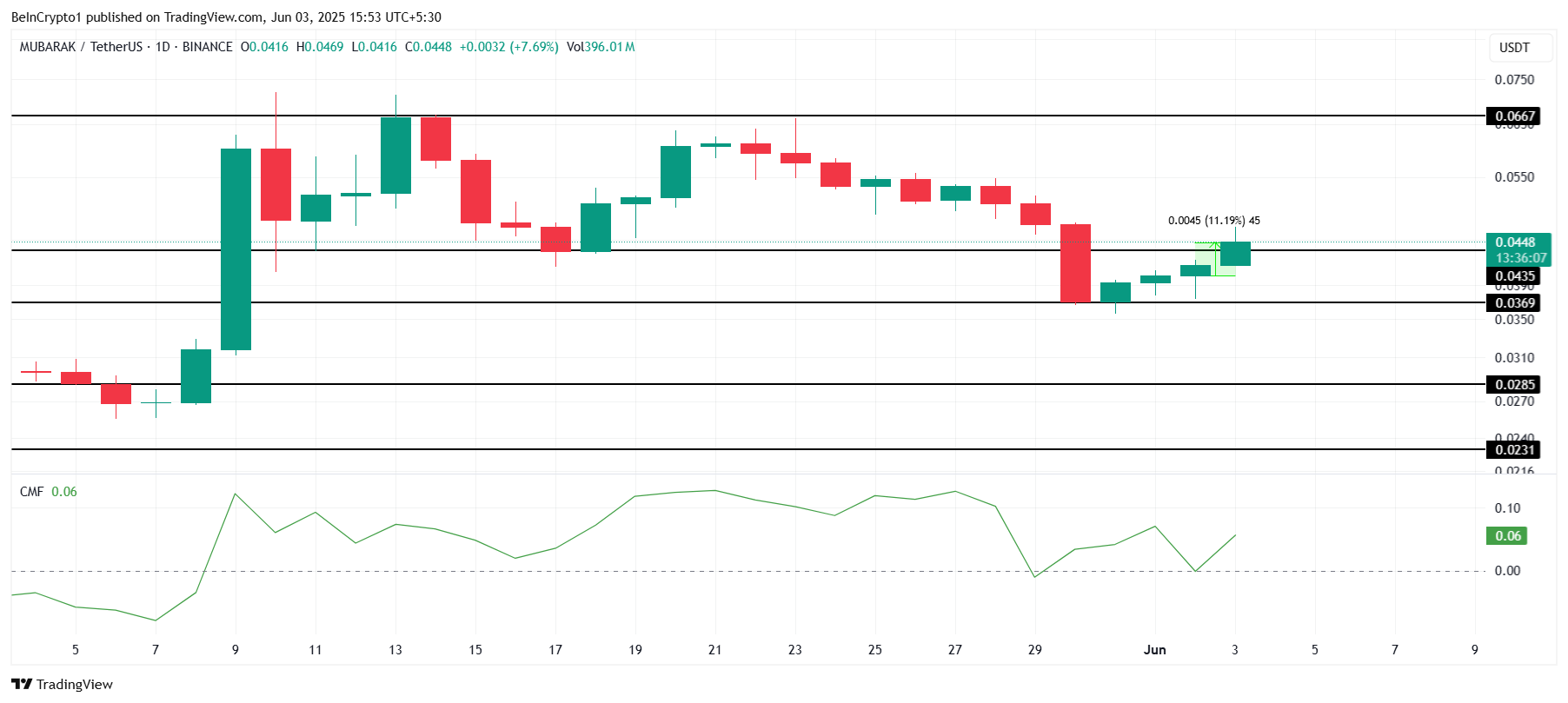 Ціна MUBARAK зросла на 11 % за останні 24 години, торгуючись за 0,044 доларів. Мемкоїн намагається закріпити 0,043 доларів як підтримку, що є критичним рівнем для його висхідного руху. Збереження цієї підтримки допоможе закласти основу для подальшого зростання цін у найближчому майбутньому.