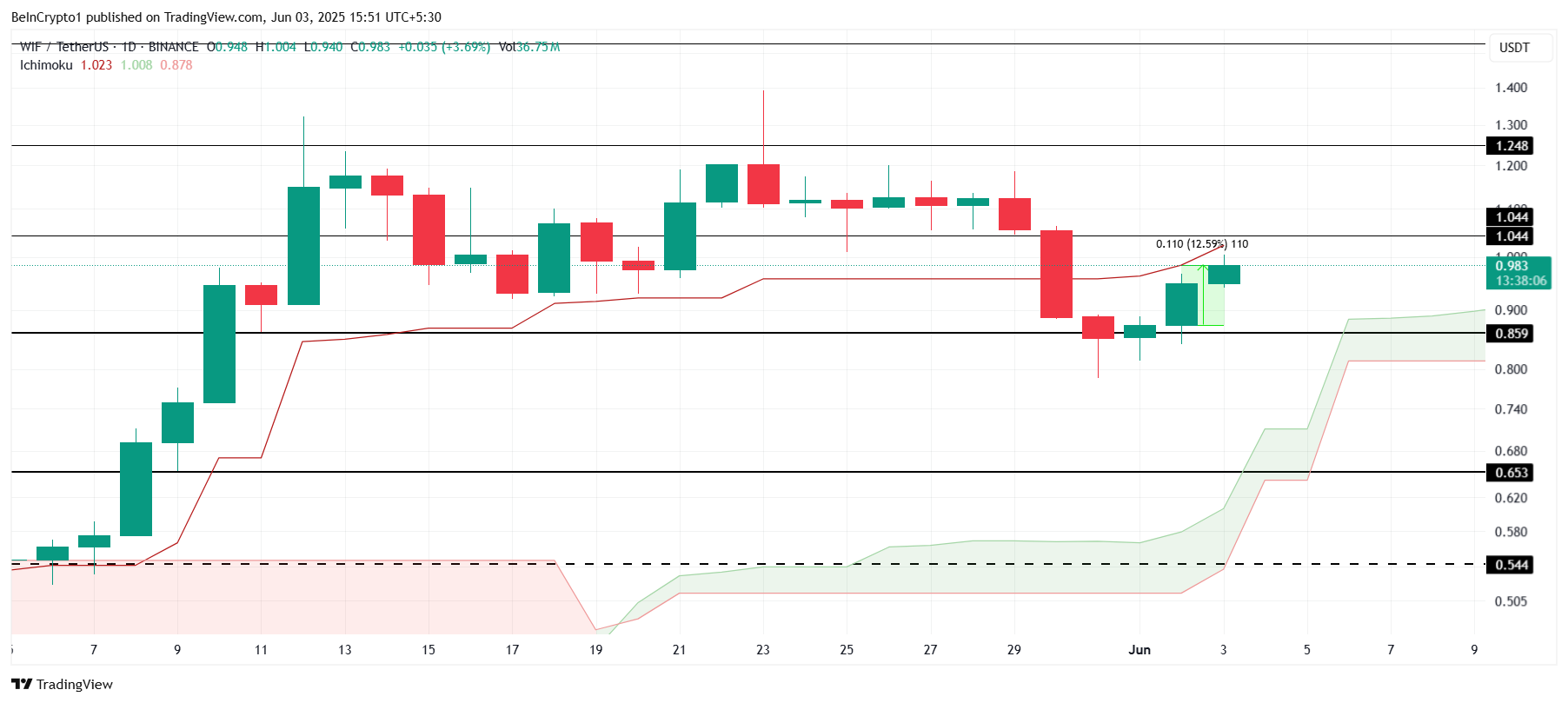 Індикатор Ichimoku Cloud під свічками вказує на потенційне продовження висхідного руху WIF. З ключовим опором на рівні 1,04 доларів, успішне подолання цього рівня може відкрити шлях для подальших прибутків, підштовхуючи мемкоїн до 1,24 доларів. Закріплення цього опору зміцнить нещодавнє зростання ціни.