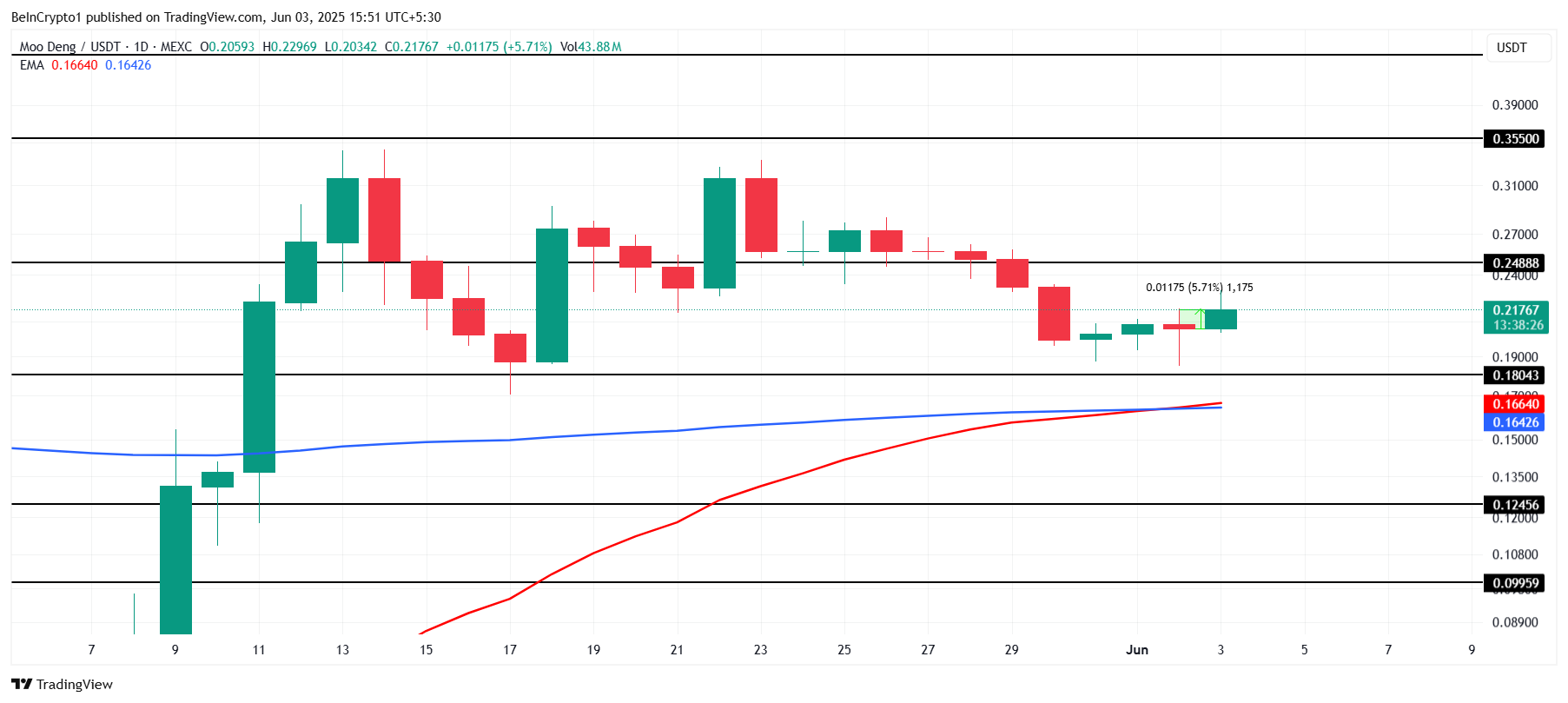 MOODENG сьогодні зріс на 5 % у ціні, що є одним з його кращих результатів останнім часом. Торгуючись за 0,217 доларів, альткоїн демонструє ознаки бичачого імпульсу, оскільки інвестори очікують подальших розробок. Альткоїн може продовжити своє зростання, якщо ці позитивні сигнали збережуться протягом наступних кількох днів.