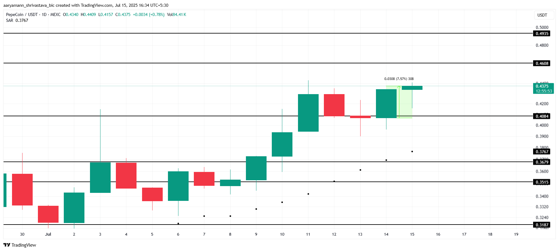 PEPECOIN зріс на 7,5 %, торгуючись на рівні 0,4375 доларів, що робить його одним із найуспішніших токенів дня.