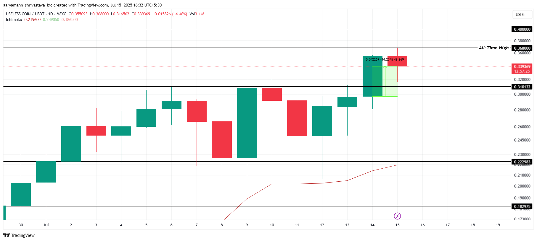 USELESS досяг нового історичного максимуму (ATH) сьогодні на рівні 0,368 доларів, перш ніж трохи знизитися до 0,339 доларів. Незважаючи на це, альткоїн утримує підтримку на рівні 0,310 доларів, що свідчить про сильний потенціал для подальшого зростання.