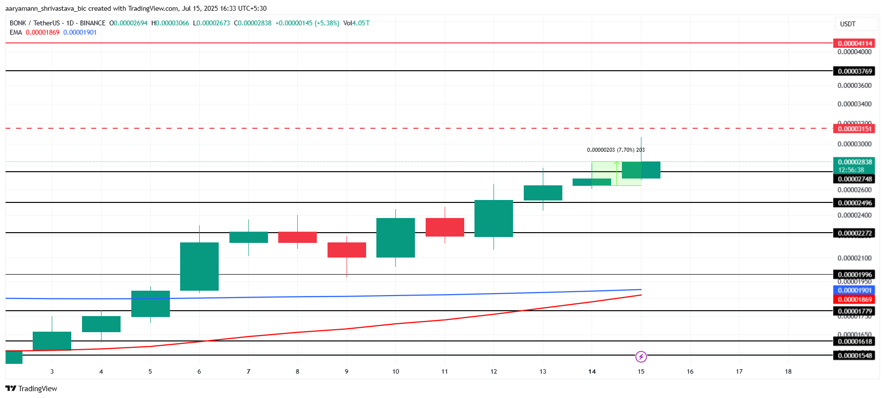 Наразі BONK торгується на рівні 0,00002838 доларів, утримуючись вище рівня підтримки 0,00002748 доларів. Альткоїн зріс на 7,7 % за останні 24 години, що свідчить про потенціал для подальшого зростання.