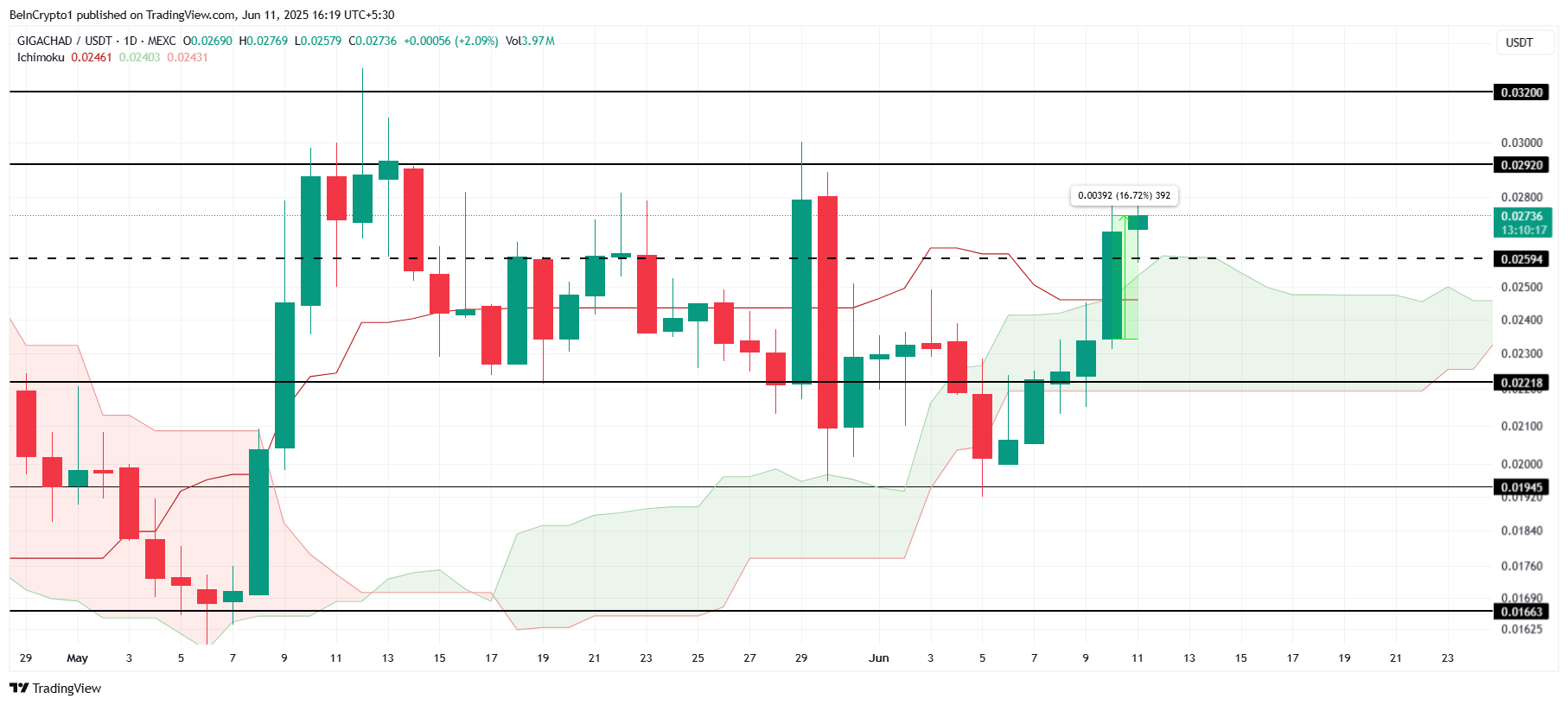 Індикатор Ichimoku Cloud, розташований нижче свічок, сигналізує, що бичачий імпульс, ймовірно, продовжиться. Якщо GIGA зможе закріпити локальний рівень опору 0,0259 доларів як підтримку, це може дозволити йому подолати опір на рівні 0,0292 доларів. Це відкриє шлях для GIGA досягти 0,0320 доларів, продовжуючи свій висхідний тренд.