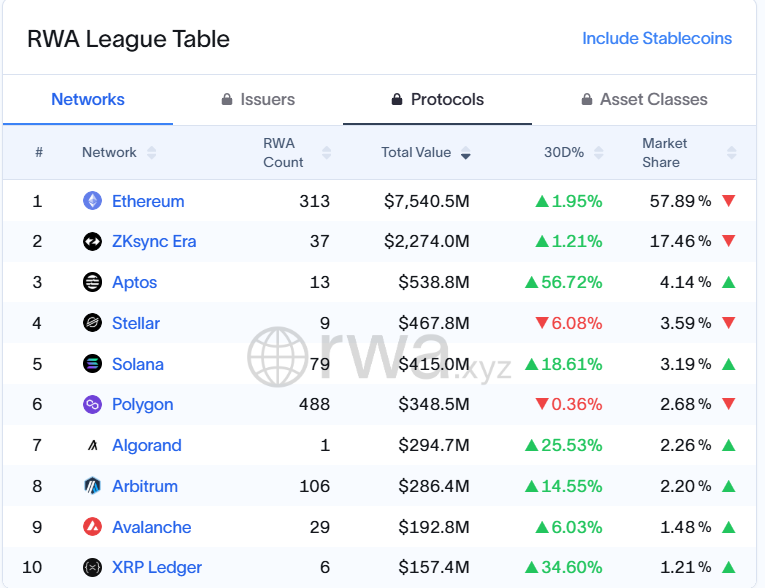 Ethereum наразі лідирує в секторі з 7,5 мільярда доларів у вартості токенізованих активів. Для порівняння, дані з RWA.XYZ розміщують XRP Ledger на десятому місці, з приблизно 157 мільйонами доларів у токенізованих активах.