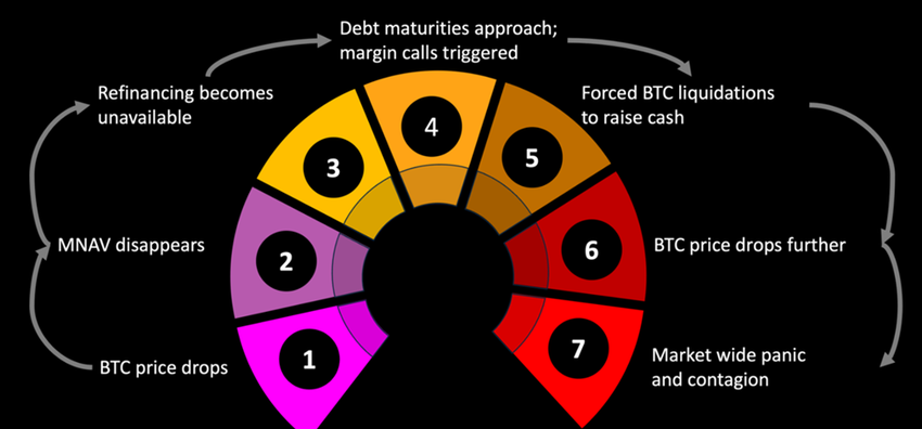 Падіння MNAV підриває вартість акцій компанії, ускладнюючи доступ до капіталу, і потенційно змушуючи продажі BTC, що ще більше знижує ціни.