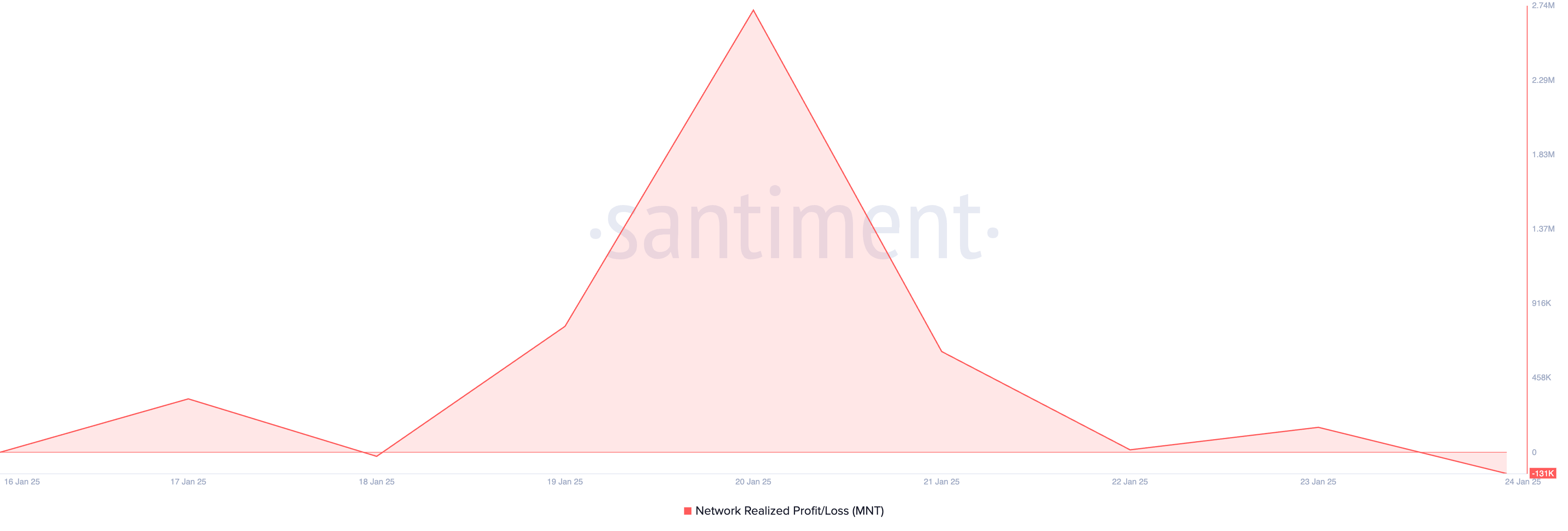 Це може стримати продажі MNT у короткостроковій перспективі, оскільки це відображає збиток для тих, хто продає нижче своєї ціни покупки. Тому, з меншим числом токенів, що продаються зі збитком, знижується тиск на ринку, зміцнюючи поточне ралі.