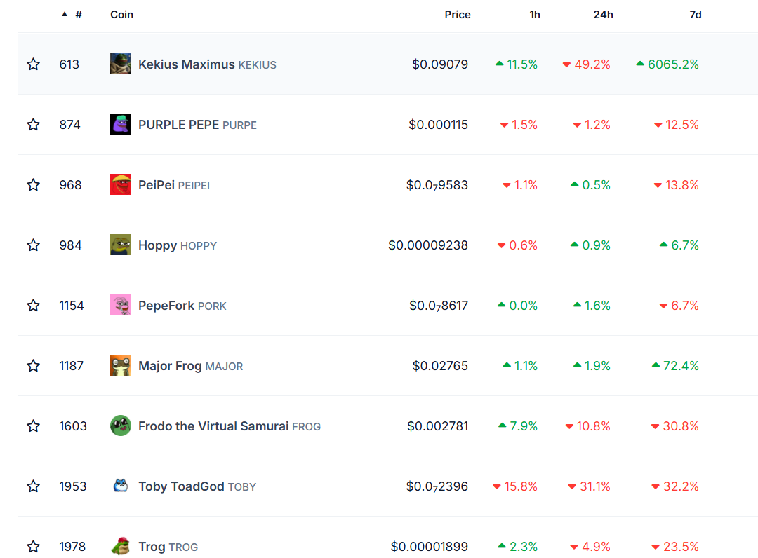 SponsoredРаніше, 31 грудня, Kekius Maximus та інші мем-монети з темою жаби вибухнули після того, як Маск змінив своє ім’я на X. За даними CoinGecko, ринкова капіталізація монет з темою жаби навіть зросла до 11,8 мільярда USD.