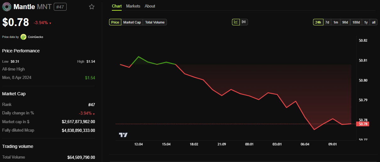SponsoredЗа даними BeInCrypto, MNT торгувався за 0,78 доларів на момент написання, знизившись майже на 4% за останні 24 години.