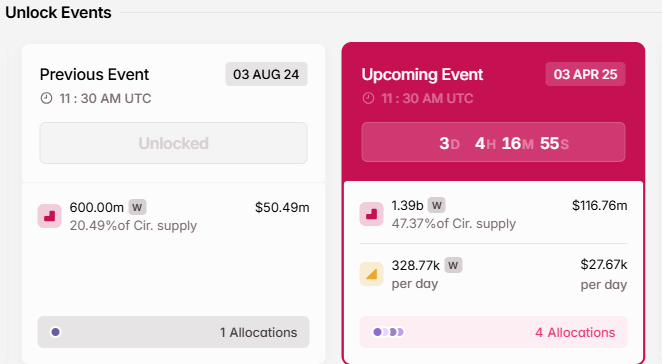 Ще однією важливою криптоновиною цього тижня є розблокування токенів Wormhole на суму 117 мільйонів доларів, заплановане на 03.04.2025. Ця критична подія для членів спільноти Wormhole стосується 47,37% циркулюючої пропозиції токена W.