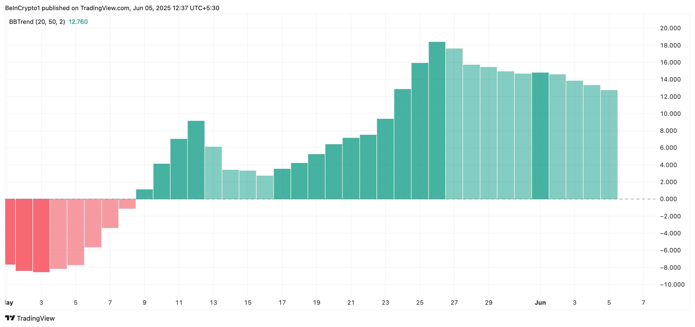 Крім того, показники індикатора BBTrend альткоїна підтримують цей бичачий прогноз. Спостерігається на одноденному графіку, індикатор наразі становить 12,76, показуючи лише зелені гістограми з 9 травня.