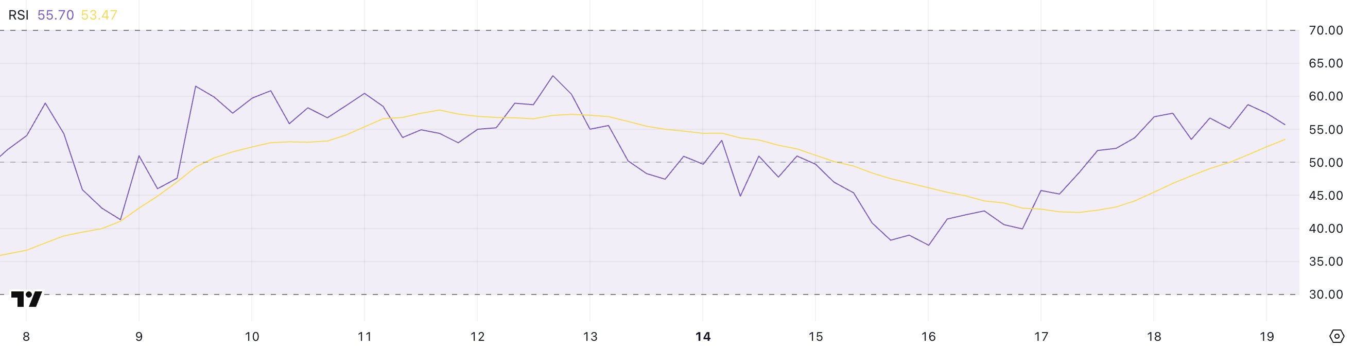 Індекс відносної сили (RSI) Hedera наразі становить 55,70, піднявшись з 45 лише два дні тому. Це зростання відображає збільшення бичачого моментуму, показуючи, що тиск покупців зріс після короткого періоду слабкості.