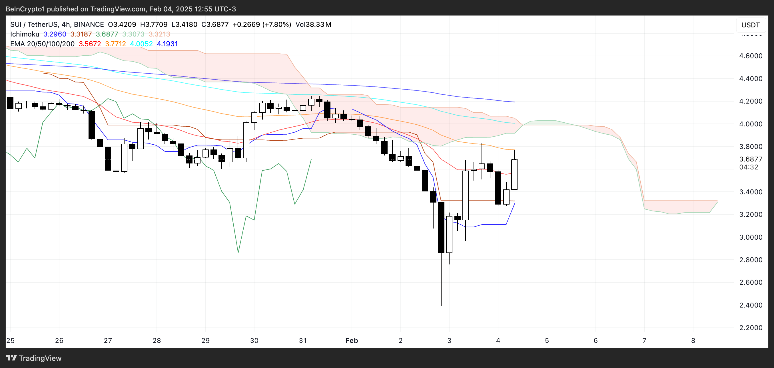 Ціна SUI зросла приблизно на 4% за останні 24 години, але залишилася на 30% нижче за останній місяць. Незважаючи на незначне відновлення, його технічні індикатори все ще вказують на загальну ведмежу установку, з обома лініями Ichimoku Cloud та EMA, які вказують на сильний опір попереду.