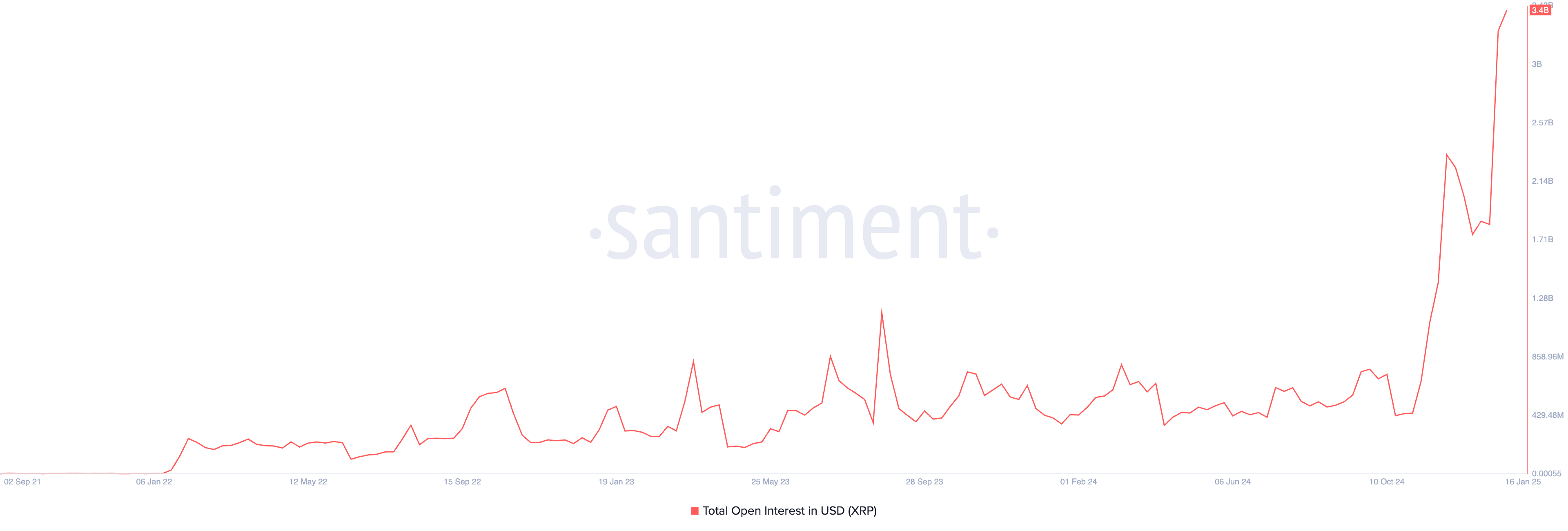 Зростаючий відкритий інтерес до XRP також досяг історичного максимуму. Це свідчить про впевненість трейдерів у подальшому зростанні. Станом на зараз, відкритий інтерес складає $3,4 млрд.