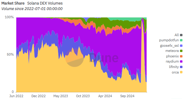 Архітектурні переваги Solana привертають трейдерів і розробників, формуючи сильну екосистему децентралізованої торгівлі. Яскравим прикладом успіху є Raydium — провідний автоматизований маркет-мейкер (AMM) Solana. За даними BeInCrypto, Raydium нещодавно домінував в обсягах торгів DEX Solana.
