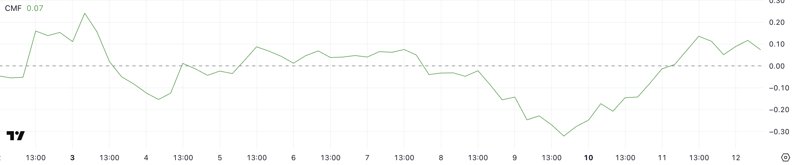 CMF вище 0,05 свідчить про зростання бичачого імпульсу, тоді як тривалі негативні показники часто узгоджуються з низхідними трендами.