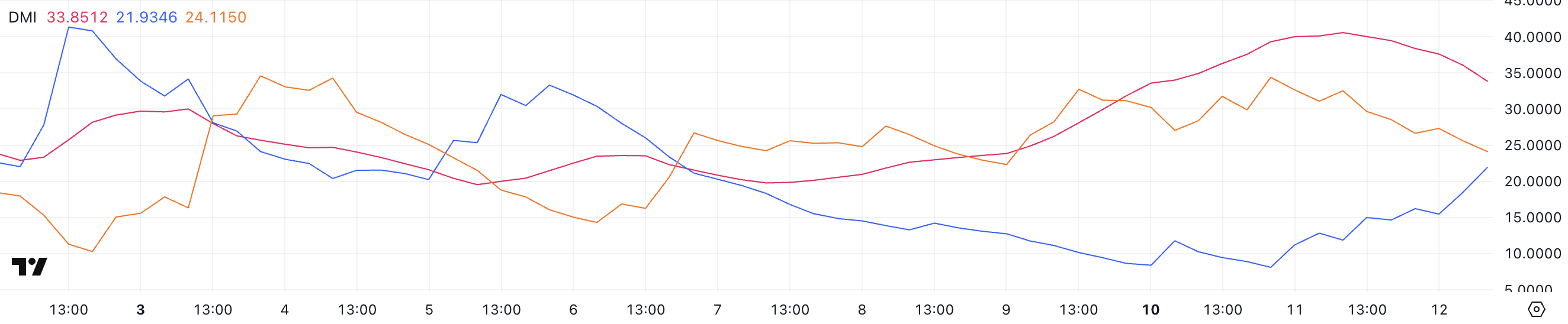 Наразі ADX ONDO становить 33,8 порівняно з 40,5 вчора. Це свідчить про те, що поки низхідний тренд залишається сильним, його інтенсивність починає слабшати.