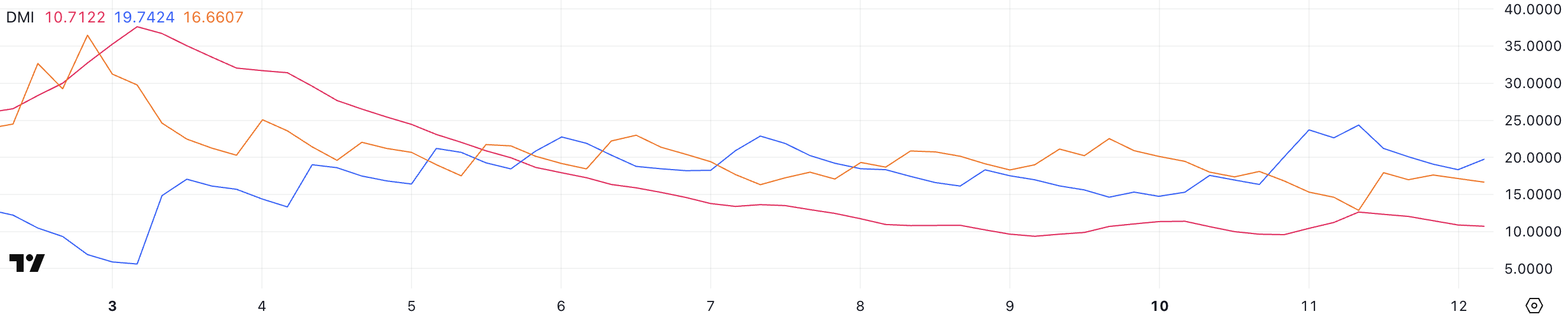 Графік DMI ONDO показує ADX на рівні 10,7, що залишається нижче 15 протягом п’яти днів поспіль, сигналізуючи про надзвичайно слабку силу тренду. ADX (індекс середнього напрямку) вимірює силу тренду, а не напрямок, причому значення нижче 20 зазвичай вказують на відсутність сильного тренду, а вище 25 – на більш усталений рух.