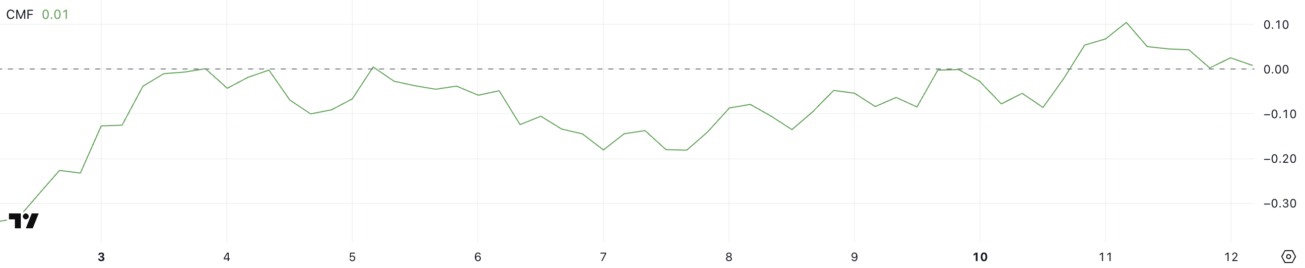 Chaikin Money Flow (CMF) вимірює тиск покупців і продавців на основі обсягу та цінової дії. Значення вище нуля вказують на акумуляцію, а значення нижче нуля сигналізують про розподіл.